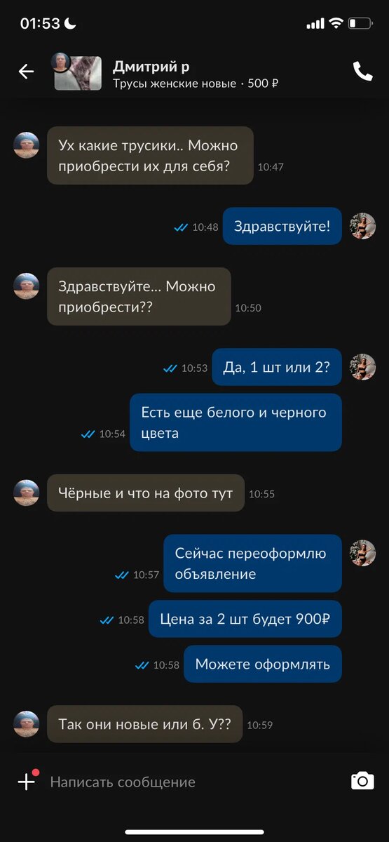 В свободное время я шью нижнее белье на наличие и часто выставляю на авито, но в последнее время пишут какие-то извращенцы. Сначала меня это раздражало, потому что отвлекает от работы, а теперь мне просто смешно)) Ниже оставлю фото с перепиской таких персонажей. А еще в последнее время просмотры объявлений снизились. Я не знаю только у меня это или еще у кого-то, но даже если покупать продвижение объявления, то ничего не меняется.