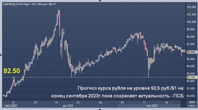 Прогноз курса рубля на уровне 92,5 руб./$1 на конец сентября 2023г пока сохраняет актуальность - ПСБ Курс доллар/рубля на Мосбирже интервалами в 1 минуту Курс доллар/рубля на Forex интервалами в 4 часа Позиции доллара выглядят слабо с технической и конъюнктурной точек зрения. Стабилизация внешнего фона и восстановление нефтяных цен в условиях повышенного предложения валюты со стороны Банка России не позволят доллару удержаться на текущих уровняз и вернут курс к нижней границе 95-96 руб./$1. На следующей неделе укрепление рубля может продолжиться благодаря приближающимся налоговым выплатам (28 сентября) и высоким ценам на нефть. Поддержку нацвалюте могут оказать заявления заместителя главы Минфина А. Моисеева о мерах валютного контроля и решение правительства РФ о введении с октября временных экспортных пошлин с привязкой к курсу рубля, способного (пусть не незначительно) повысить предложение валюты на рынке. "Пока сохраняем наш ориентир по доллару на конец сентября на уровне 92,5 руб./