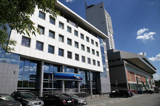 "Юг" - так называется гостиница, в которой мы остановились. Гостиница занимает самый верхний этаж вот этого здания (в соседнем - есть продуктовый магазин и несколько точек общепита). Вдоль всего этажа имеется открытый балкон, с которого открывается интересный вид (и утром, и ночью). Можно полюбоваться башней РЖД и небоскрёбом "Исеть", который вечером и ночью расцвечен огнями. При известной сноровке, можно разглядеть (угадать) места расположения нескольких городских достопримечательностей. Эта гостиница была выбрана из соображений транспортной доступности (недалеко жд вокзал, станция метро, автобус до аэропорта, трамвай), наличия завтрака и неплохих номеров. Вокруг довольно тихо. Совсем рядом расположено здание старого вокзала с железнодорожным музеем, место начала строительства метро и дом культуры железнодорожников, возле которого расставлены несколько единиц различной техники (от паровоза братьев Черепановых (памятник) до танка Т-72 (оригинал)). Так что есть на что посмотреть. Коне