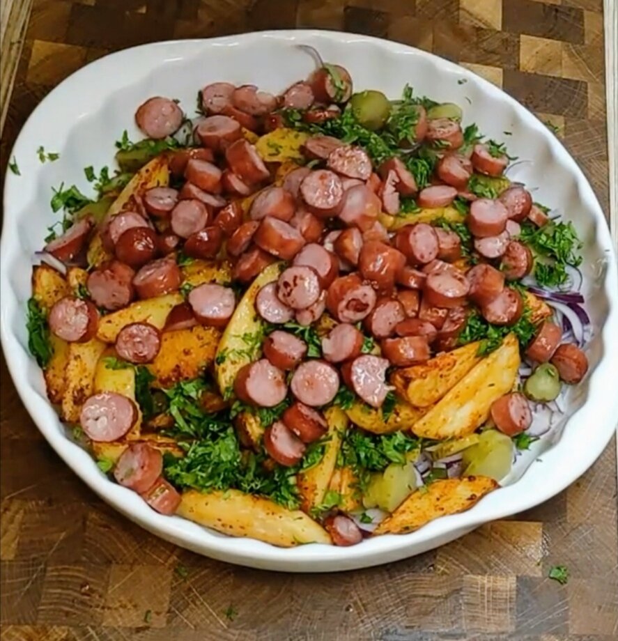 Здравствуйте, дорогие читатели! Этот салат улетел со стола мгновенно. Ребятишки были особенно в восторге. Думаю это благодаря охотничьим колбаскам.🤭 Естественно, я не сделала ни одной фотографии. Действительно, недоблогер как-то. Пришлось стащить фотографию из интернета. Прошу понять и простить.🙏 Ингредиенты на 4 порции. Охотничьи колбаски - 300 г. Маринованные огурцы - 200 г. Красный лук - 1 шт. Картофель - 2-3 шт. Чеснок - 1 зубок. Петрушка, укроп – 3-4 веточки. Горчица - 1 ч.л. Винный уксус или лимонный сок - 1 ст.л. Растительное масло - 50 мл. Соль, острый перец - по вкусу. Сразу замечу, что мы делали без специй, горчицы, чеснока и винного уксуса. Потому что дети ничего острого не едят. А чеснок я не люблю. Процесс приготовления. Очищенный картофель режем ломтиками или дольками. Добавляем соль и растительное масло (можно любимые специи) всё перемешиваем. Картофель запекаем в духовке, включив режим конвекции, при температуре 200 градусов около 15 минут. Лук режем тонки