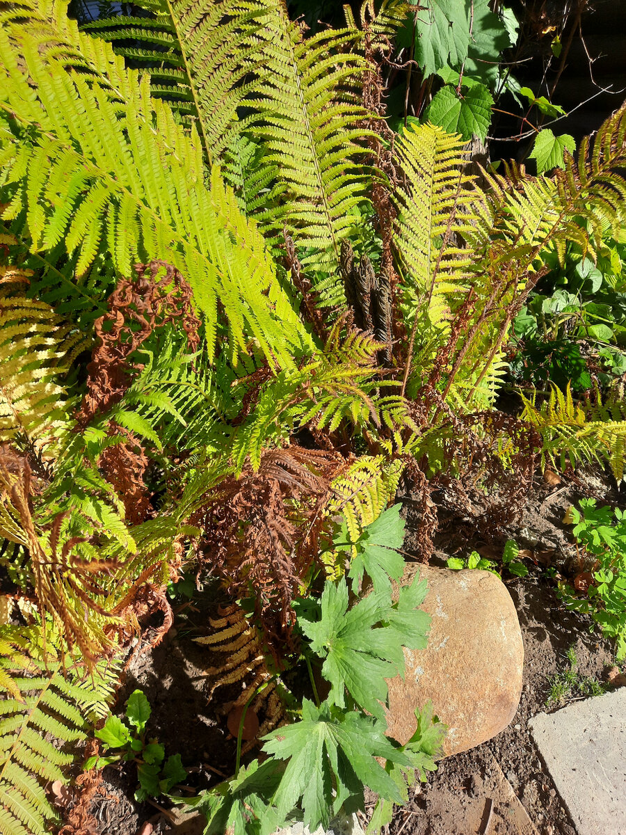 Самый яркий образ на данный момент, засыхающие вайи папоротников и камень. Ему сейчас достается столько света. Он открыт солнцу и моему взгляду.