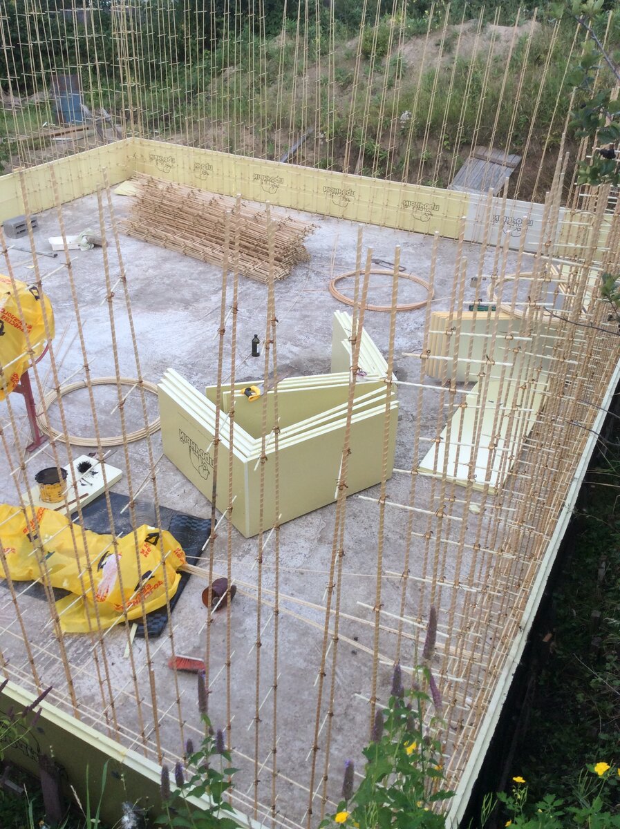 В 2019 году, после болезни, покинул этот прекрасный мир мой муж. Невыносимая боль поселилась внутри, было трудно говорить и просто дышать. Спасение нашла на даче, там у меня была залита плита под строительство дома. Собралась, и решила, что надо продолжить строительство дома. Решила заливать цоколь в несъемную опалубку. Работа лечит не только тело, но и душу. Увлеклась. Боль постепенно начала отступать. В стенах использовала композитную арматуру из стекловолокна. Легко с ней работать. Она легко пилится обычной пилкой по металлу. Болгаркой, как мне советовали, пилить не надо. Почему? Стеклянная пыль попадает везде, из легких она не выводится, а тело, после попадания на него пыли, воспаляется. Собрала опалубку стен цоколя. Взяла мерные ведерки, для того чтобы получить из бетономешалки раствор бетона хорошего качества. Стяжки для опалубки пришлось сделать самостоятельно, дороговато было покупать. Для стяжек пригодилась металическая перфолента и вязальная проволока 2 мм. Один