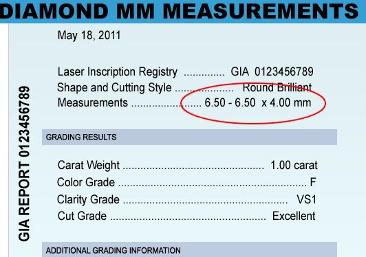 Вот почему для определения приблизительного веса в каратах используются миллиметры. Приблизительный вес необходим, когда ювелир пытается определить вес бриллианта в оправе в каратах. Эти размеры в миллиметрах указаны в сертификате на бриллиант, как показано ниже…