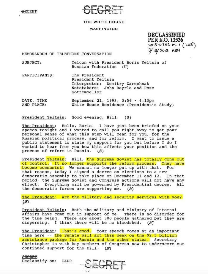 21-го сентября 1993 года между президентом США Клинтоном и Борисом Ельциным произошел телефонный разговор следующего содержания: Ельцин: Билл, Верховный Совет полностью вышел из под контроля. Он больше не поддерживает реформы. И вообще они там стали коммунистами. Я решил его разогнать. Клинтон: Армия и спецслужбы на твоей стороне? Ельцин: Да. Клинтон: Хорошо. На неделе Сенат выделит вам ещё $2,5 млрд. Архив президентской библиотеки Клинтона, запись разговора от 21 сентября 1993 года. https://clinton.presidentiallibraries.us/items/show/57568 __________________________________________________________________________________________ Источник: https://dzen.ru/a/ZQ0XiAppURyInW9b?share_to=vk