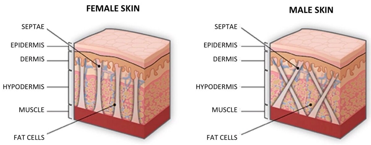 Целлюлит - это в первую очередь проблема женщин. И толстеньких и худых. 👠 У всех людей есть жирок, и он разделен волокнами из соединительной ткани. Так вот у женщин эти волокна-перегородки перпендикулярно кожи, а у мужчин нет. Каждое волокно крепится к коже и тянет ее вниз, а находящийся между перегородками жирок выталкивается наверх и вспучивает кожу. 😱 Так и появляется эффект стеганного матраса, апельсиновой корки, творожка и тд. Задумка природы в том, чтобы женщина во время беременности могла быстро откладывать необходимый жировой запасик. 🤰 У мужчин структура другая. Там перегородки идут диагонально и пересекаются друг с другом. Они плотно удерживают ткань. ❌❌ Так что все крема от целлюлита не работают. Они недостаточно впитываются. Они не в состоянии проникнуть в жировую ткань и изменить узор волокон. Правильное питание ( в т.ч. наличие антиоксидантов в пище), отказ от курения, физические нагрузки и массаж помогут жидкости не застаиваться в жировой ткани и сохранять упру