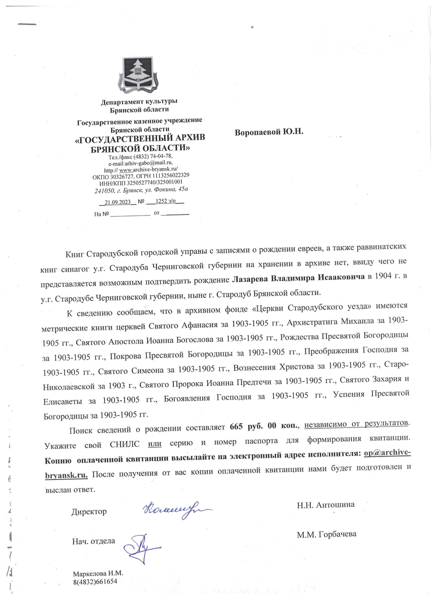 Запрос на выдачу официальной архивной справки о рождении на бланке архива, был выслан после обеда 19-го сентября 2023, через систему электронного документооборота, которую мы строим 4 года с 2600+ архивами по всей территории РФ, бывших советских республиках, Польше, Финляндии и Китаем. Уже через 2 (ДВА ДНЯ КАРЛ!) мы получаем официальный ответ от архива. Клиент получил отказную справку для Консула и может использовать другие доказательства еврейской национальности для репатриации в Израиль и получения гражданства. Кстати Advengene 4 года исполнилось 16 сентября 2023.