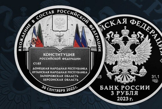 Банк России выпустил в обращение памятную серебряную монету к годовщине вхождения ДНР, ЛНР, Запорожской и Херсонской областей в состав РФ. Монета номиналом три рубля имеет массу драгоценного металла в чистоте 31,1 грамма и изготовлена из сплава пробы 925, сообщили на сайте ЦБ. С лицевой и оборотной сторон монеты по окружности имеется выступающий кант. На лицевой стороне монеты расположено рельефное изображение государственного герба РФ, имеются надписи «Российская Федерация», «Банк России», номинал монеты — 3 рубля, дата — 2023 год, обозначение металла по периодической системе элементов Менделеева, проба сплава, товарный знак Санкт-Петербургского монетного двора и масса драгоценного металла в чистоте, — говорится в пресс-релизе. На оборотной стороне монеты изображены Георгиевский зал Кремля , герб РФ и флаги Донецкой и Луганской народных республик и Запорожской и Херсонской областей. В нижней части расположено стилизованное изображение Конституции РФ, раскрытой на статье 65, в которой