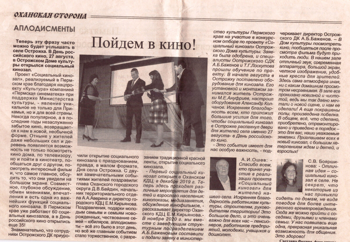Теперь эту фразу часто можно будет услышать в селе Острожка. В День российского кино, 27 августа (2021), в Острожском Доме культуры открылся социальный кинозал. Проект «Социальный кинозал», реализуемый в Пермском крае благодаря нацпроекту «Культура» компанией «Пермская синематека» при поддержке Министерства культуры, явление уникальное не только для Прикамья, но и для всей страны. Некогда популярное, а в последние годы незаслуженно забытое кино, возвращается к нам в новой, необычной форме. Отныне у жителей даже небольших сел и деревень появляется возможность не только посмотреть кино дома, по телевизору, но и пойти в кинотеатр, пообщаться друг с другом, посмотреть интересный фильм и, что самое главное, обсудить то, что они увидели на большом экране. С. Фотина «Оханская сторона» - 2021 .- 3 сентября