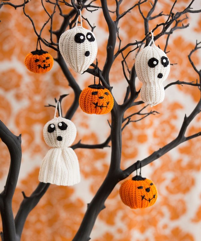 Канун Дня всех святых или Хэллоуин постепенно завоевал сердца людей по всему миру. Может это и наш праздник, но это ярко и позитивно. Не будем вдаваться в историю праздника, а просто сделаем своими руками красивый интерьер для дома, школы или офиса. Секрет самого красивого и веселого праздника Хеллоуин заключается всего в трёх «ингредиентах»: наличии крючка, цветной пряжи и воображения! ПыСы. Это статья не про схемы, эта статья про идеи. Все схемы можно найти на просторах интернета. 1.Тыква. Главный атрибут этого праздника - Тыква с улыбкой. Можно расставить на полках тыковки или поставить на стол корзинку с тыквами. Связать их из всех осенних оттенков желтого, оранжевого и коричневого. 2.Летучие мыши. Это может быть гирлянда из летающих мышек, или букет из осенних листьев в которых на тонких палочках разместить стилизованных кровопийц. 3.Паутина. Украсить шторы или стену паутиной. И добавить паучков! 4. Венок на дверь. Не важно, живёте вы в частом доме или же в отдельной квартире –