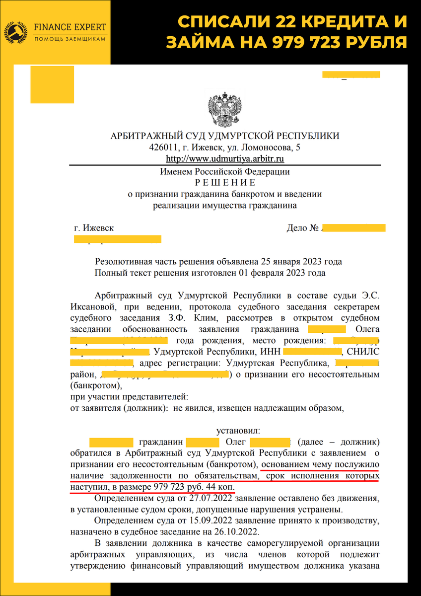 Процедура длилась чуть дольше, чем обычно, поскольку кредиторов было очень много и они до последнего ходатайствовали о несписании. Но с нашей помощью суд всегда встаёт на сторону заёмщика, поэтому долг перед 22 банками и займами на сумму 979 723 рубля был благополучно списан