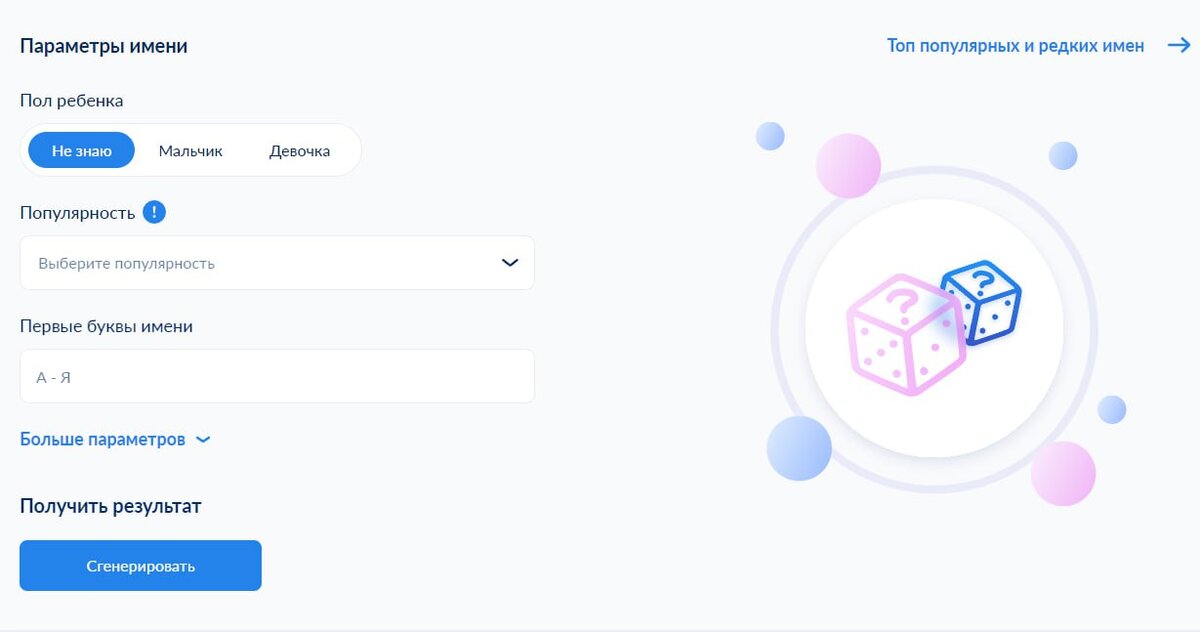 Федеральная налоговая служба (ФНС) на базе государственного реестра актов гражданского состояния запустила сервис по подбору имени ребенка. Сразу после запуска сервис временно приостановил работу с целью защиты от хакерских атак. В базе сервиса 5 тыс. уникальных имен, которые были зарегистрированы в реестре ЗАГС с 1 октября 2018 года. С его помощью родители могут подобрать имя своему ребенку по различным критериям: по сочетанию имени и отчества, по пожеланиям к популярности или редкости имени, по первым буквам или длине. Есть возможность подобрать имя с учетом региональных и национальных особенностей. Также система может сгенерировать имя случайным образом В России в 2023 году самые распространенные имена девочек — София, Ева, Анна, Мария и Виктория, а среди мальчиков — Михаил, Артем, Александр, Матвей и Максим. Помимо сервиса на портале опубликована база имен с 1926 года. Имена расположены в порядке от самого популярного до самого редкого за последние 100 лет. Также там можно посмотре