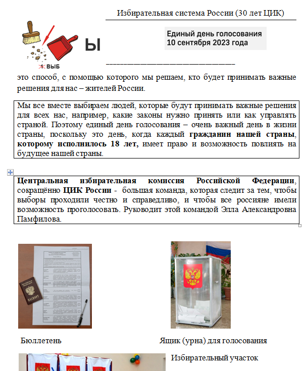 Цель следующего занятия "Разговоры о важном" - формировать общие представления обучающихся о правах и обязанностях гражданина в современном обществе. Совсем недавно в России состоялся Единый день голосования. В некоторых семьях есть традиция в этот день все вместе идти на избирательный участок и сделать свой выбор. Некоторые дети знают, как проходят выборы. В далёком детстве мы с папой просыпались рано утром и шли на выборы.Это был праздник! Во времена тогдашнего дефицита в такие дни работали буфеты, где можно было купить множество нужных продуктов. Делаем акцент на том, что принимать участие в выборах может гражданин России с 18 лет. Рассказываем, как проходят выборы, кто следит за тем, чтобы они были справедливыми. На выборах есть атрибуты: избирательный участок, бюллетень, урна для голосования. В конце занятия можно предложить нарисовать рисунок на тему «Я с родителями иду на выборы». На сайте уже готовы материалы. "Академия СОВА" опубликоваа видео. "Выборы как традиция" "Избира