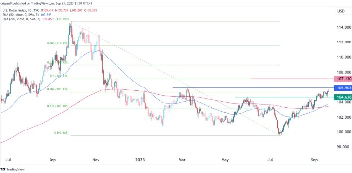 Рост индекса доллара США (DXY) продолжился в этом месяце, поскольку инвесторы отреагировали на решения нескольких центральных банков по процентным ставкам. Индекс поднялся до многомесячного максимума в $105,72, что примерно на 6,28% выше самого низкого уровня в этом году.