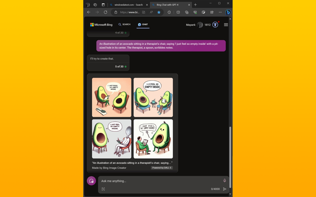 Microsoft Bing Chat уже предлагает обновленную версию инструмента преобразования текста в изображения OpenAI, известного как DALL-E 3, для избранной группы пользователей. Эта интеграция позволяет пользователям превращать описания изображений в подробные иллюстрации, и он даже может встраивать туда текст, с чем большинство моделей справляется очень плохо. По сравнению с предыдущей версией DALL-E 3 значительно улучшены возможности генерации. Например, если попросить DALL-E 3 создать изображение авокадо в кресле терапевта с надписью «Я чувствую себя таким пустым внутри» и отверстием размером с ямку в центре, а также ложку-терапевта, делающего записи, то DALL-E 3 сможет точно создать нужное изображение с корректно вставленным текстом. Хотя точное количество пользователей, имеющих доступ к DALL-E 3, пока не раскрывается, OpenAI подтвердила, что ее платные клиенты смогут получить доступ к обновленной модели, а пользователи Bing Chat смогут использовать эту функцию бесплатно.