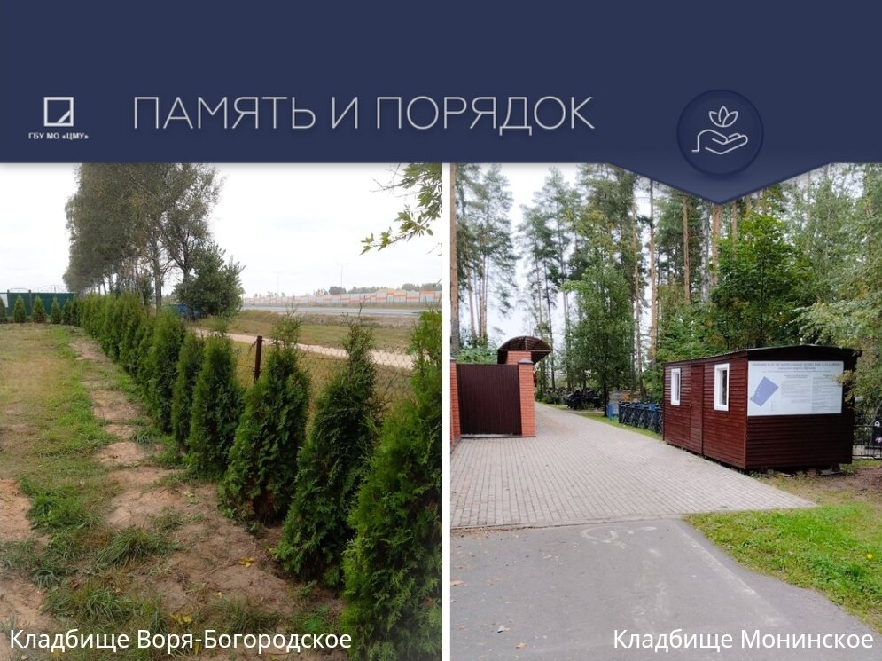 В рамках общего проекта по улучшению территорий похоронного назначения Подмосковья проведены работы по благоустройству кладбищ г.о. Щелково. ️На кладбище Воря-Богородское были высажены ряды туевых деревьев. Вечнозеленые хвойные растения посажены параллельно забору и в дальнейшем будут использованы в качестве живой изгороди. Туи придадут погосту не только эстетическую привлекательность и ухоженность, но и функционально разделят пространство кладбища и окружающей его территории. ️На кладбище Монинское была проведена покраска объекта для хозяйственно-бытовых нужд. Эта работа также является одним из этапов создания комфортных условий для всех, кто приходит на кладбище посетить места упокоения родных и близких. #памятьипорядок #гбумоцму #московскаяобласть #подмосковье #мо #щелково #благоустройствокладбищ #монинскоекладбище #ворябогородское