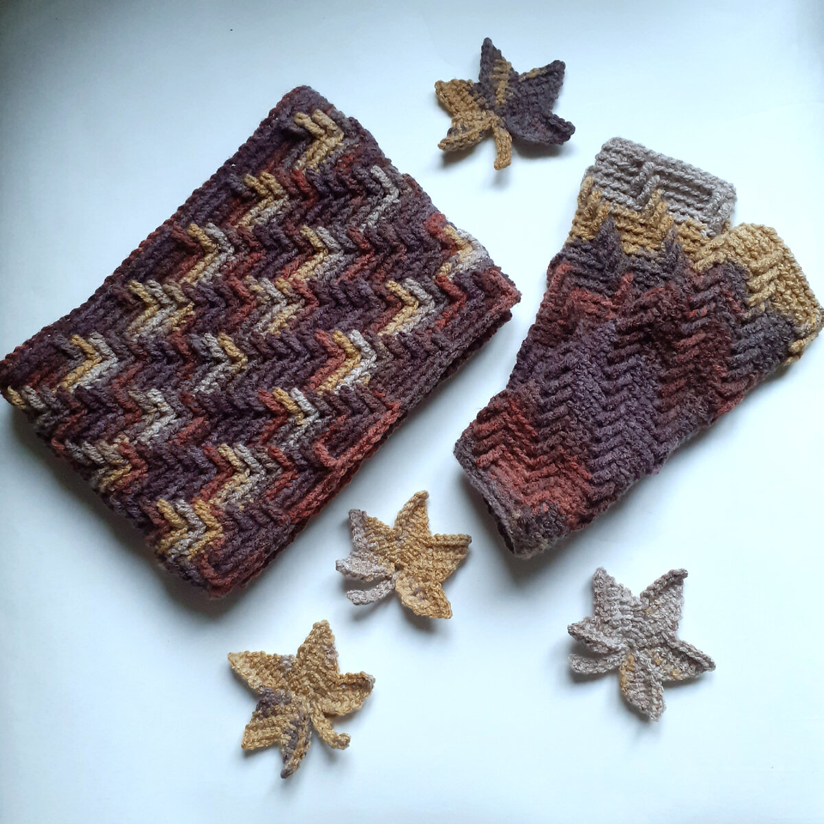 Этот проект из разряда спонтанных и тот случай, когда все пазлы сошлись))) На мой взгляд, узор гармонирует с цветом пряжи, а фактура пряжи с узором. Вязала с удовольствием, правда, не без запинок. Пару раз откладывала, чтобы связать... листики. Нравятся мне такие маленькие вязаные штучки. Правда, так и не попала на кирпично-коричневый оттенок нити. Но обо всём по порядку... О пряже Узнали ли вы пряжу? Да. Это Ализе Буркум Батик (100% акрил, 210 м/100 г). Четыре моточка лежали уже, наверное, год. Брала для подушки. Но когда дошло дело до вязания, показалось, что слишком тёмная пряжа, а смурную подушку мне почему-то очень не хотелось. Впрочем, можно было подобрать светлого компаньона и вязать мозаичным узором. Турецкая пряжа Ализе Буркум просто создана для мозаики. Что касается снуда и митенок... Подходит ли такая пряжа, ведь это 100% акрил? Мне нравится она на ощупь. Хотя и акрил, но нет ни скрипа, ни запаха. По структуре похожа на шерсть, только не колется. К тому же снуд ведь носится
