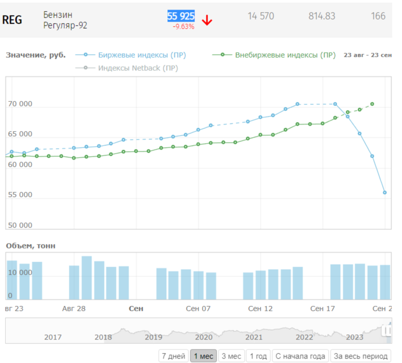 Немаловажную роль в данном ускорении инфляции сыграли нефтепродукты. Наши нефтяники смекнули (Лукойл, Татнефть, Роснефть и т.д.), что на рынке есть весомый спрос на топливо и резко сократили производства бензина (-0,6%), дизеля (-4,5%) с 11 по 17 сентября 2023 года (неделю назад — бензин -5,9%, а дизель -3%). Конечно из-за сокращения предложения цены на бензин (0,8%) и дизель (2%) выросли.