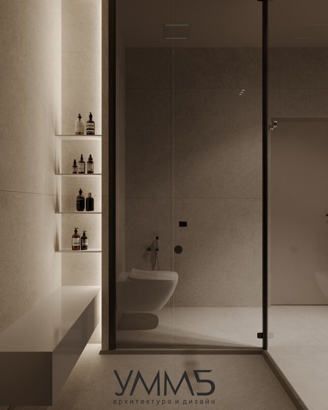 Из спальни есть проход в санузел, дверь из которого ведет в гардеробную и далее в гостиную. Ванная комната оформлена в той же плитке, что и гостиная. Главной особенностью здесь является душевая выполненная в виде стеклянной кабины. Внутри в нишу встроены открытые полки с подсветкой, а также спроектирована широкая полка, выполненная из акрила. Возле унитаза размещен гигиенический душ и пневмо-кнопка нестандартно расположена на стене рядом. Напротив спроектирована подвесная тумба на две раковины и широкое зеркало с подсветкой как по периметру, так и внутри. Еще одним особенным решением в этом санузле стало использование матового стекла в качестве перегородки между ванной и гардеробной, благодаря ей естественный свет, который с террасы проникает в комнату попадает и в душ.