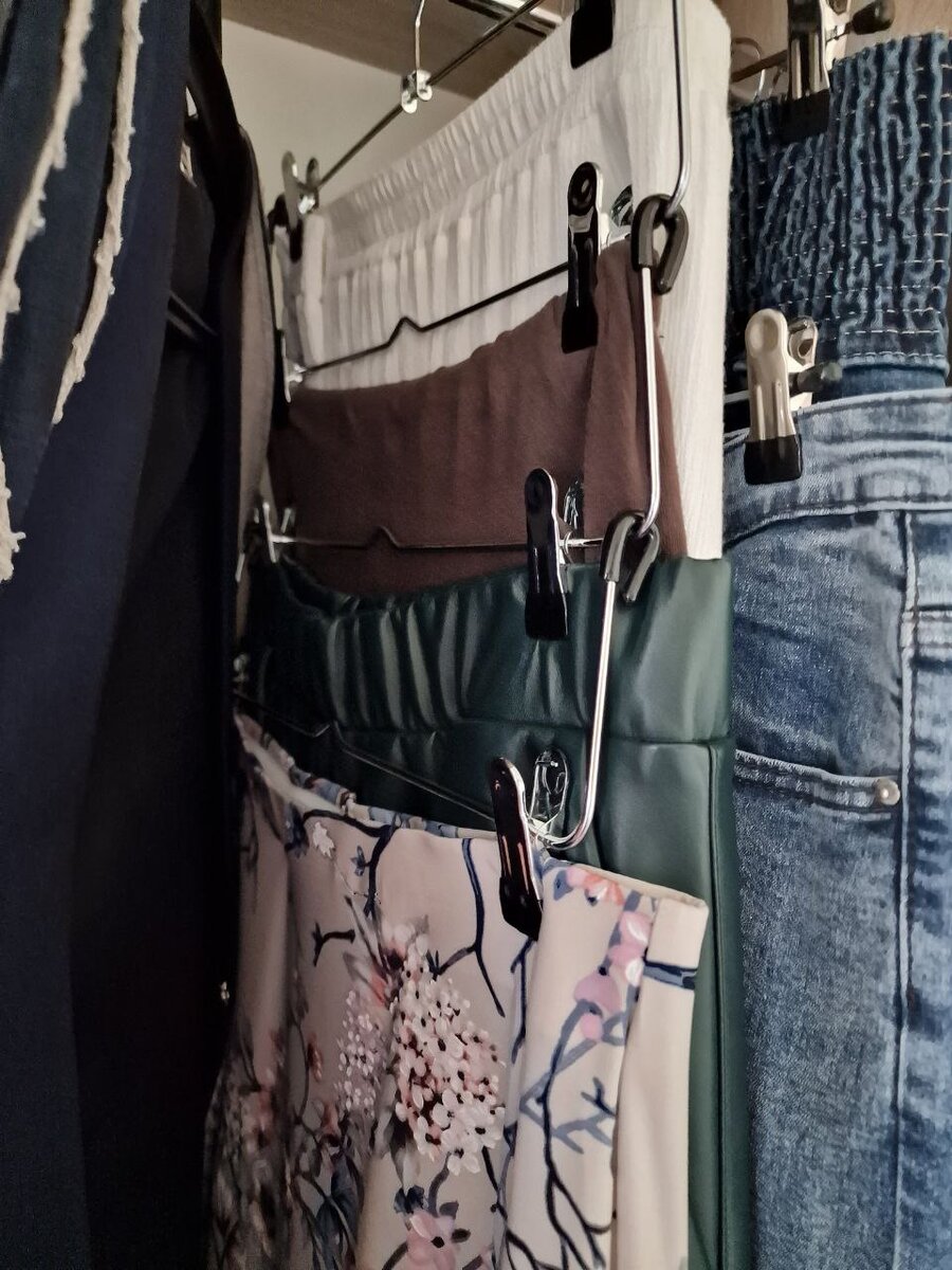 Вот мы с вами уже избавились от всего ненужного, того, что стало мало/велико, вышло из моды, стало не интересно или совсем истрепалось. Теперь давайте сделаем наш шкаф удобным для хранения того, что осталось. Сразу же поделим вещи на те, что будут храниться на полочках, например, белье и вязаные свитера и кофты и те, что будут висеть на вешалках – платья, рубашки, юбки… Все, что мы носим постоянно, должно быть максимально доступно. То, что достаем время от времени, можно убрать на верхнюю полку или вглубь шкафа. Для того, чтобы увеличить полезную площадь, можно использовать многоуровневые вешалки. Они есть как для брюк/юбок, так и для футболок и рубашек. Для платьев, особенно длинных, такой вариант, конечно, не подойдет, но, положа руку на сердце, скажите, много ли у вас в гардеробе длинных платьев? Кстати, не обязательно гоняться за специализированными вешалками. Можно взять недорогие крючки, которые превратят обычные вешалки в многоуровневые. И совершенно волшебная штука – органайзер