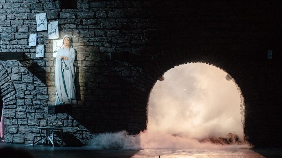 В остальном же картинка от сценографа Александра Арефьева и художника по костюмам Светланы Тегин вполне удовлетворит любителя «гранд-оперá а ля рюс»: кокошники, сарафаны, косы до пят обильно украшают пространство спектакля, ограниченное циклопической полукруглой конструкцией грубой серокаменной кладки. Когда на увертюре открывается занавес, эта громада показана тыльной стороной и напоминает старые крепости, вроде Изборской на Псковщине. Потом по ходу действия она развернется на поворотном круге и откроет внутренний «амфитеатр», похожий на античный. Такая организация сценического пространства, в котором можно показать все и разом, — очевидный плюс в организации постановки.