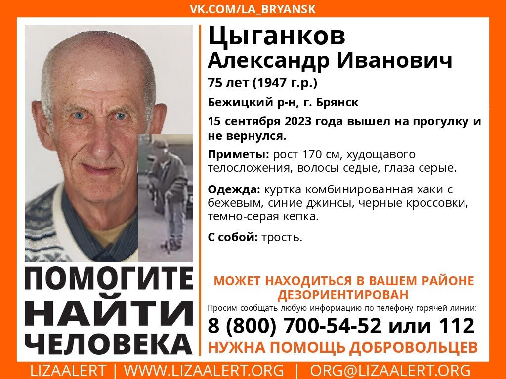 В Бежицком районе Брянска 15 сентября пропал 75-летний Александр Цыганков. Он ушел из дома на прогулку и не вернулся. Мужчина нуждается в медицинской помощи, дезориентирован, страдает провалами в памяти и может находиться в любом районе областного центра и даже за его пределами. Для ходьбы Александр Иванович использует трость, постоянно спрашивает у прохожих который час. Об этом сообщили волонтеры поисково-спасательного отряда «Лиза Алерт». Александр Цыганков попал на камеры видеонаблюдения. Всех, кто располагает сведениями о пропавшем, просят позвонить по телефонам 8-800-700-54-52 или 112. В Брянске продолжаются поиски 75-летнего Александра Цыганкова (ВИДЕО)