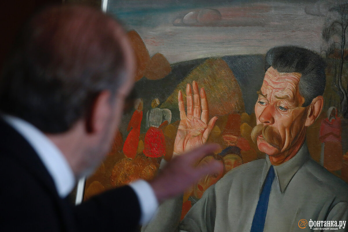 «Портрет Горького тоже относится к «Ликам России», — поясняет Тамара Галеева. — Все эти вещи были на большой персональной выставке Григорьева в Нью-Йорке, и оттуда работы, в том числе «Ревизора», купили в частные собрания. И мы эту работу не видели много десятков лет, пока её лет пять назад не купил фонд «Связь времён».