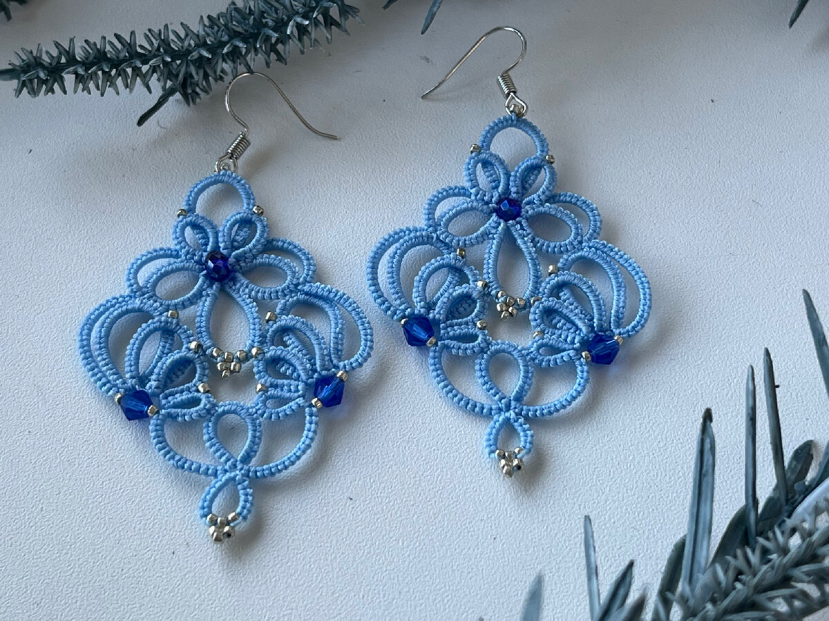 Серьги выполнены в старинной технике челночного плетения по фото из интернета.