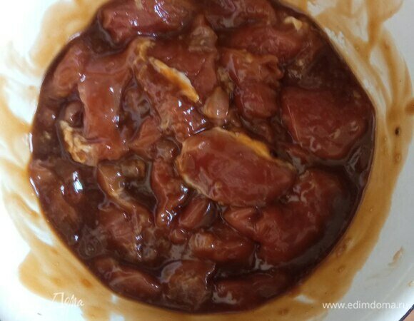 перец черный молотый - 1по вкусу Шаг: 1 Смешиваем маринад: соединяем все ингредиенты, чеснок пропускаем через пресс. Свинину режем тонкими пластинами. Можно немного отбить. Помещаем свинину в маринад, закрываем пищево