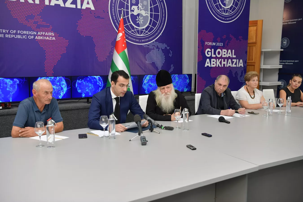 Пресс-конференция министра иностранных дел Абхазии Инала Ардзинба с участием секретаря Совета безопасности республики Сергея Шамба, председателя политической партии "Амцахара", Героя Абхазии Лесика Цугба, главы Абхазской Православной Церкви иерея Виссариона (Аплиаа) и кандидата экономических наук, ведущего научного сотрудника Института экономики и права Академии наук Абхазии Фриды Лазба прошла в Медиацентре МИД в пятницу 22 сентября.