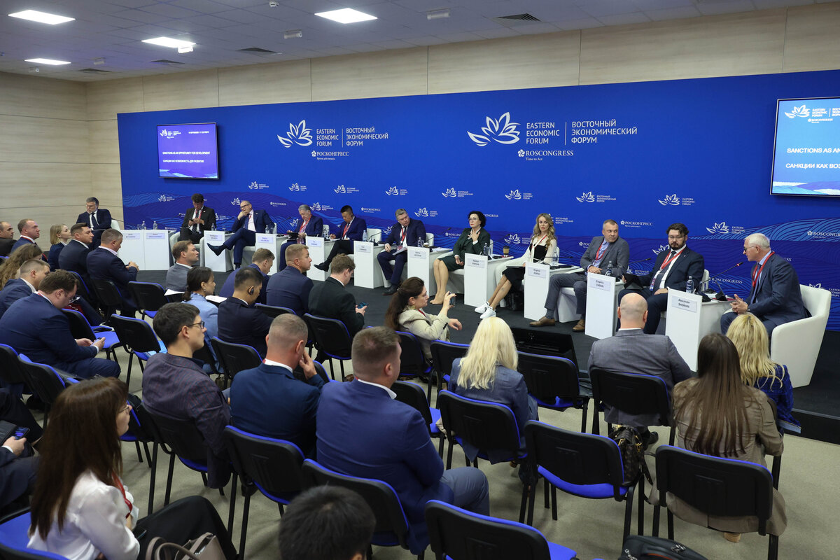11 сентября 2023 года в рамках Восточного экономического форума состоялась сессия «Санкции как возможность для развития», на которой спикеры высказались о влиянии санкций на российскую экономику и о возможностях, возникших для отечественных производителей в условиях санкционной борьбы. Ректор Российского экономического университета Иван Лобанов. отметил, что санкции послужили стимулом для быстрого изменения структуры экономики и установления ее устойчивого развития. Он также подчеркнул, что ряд отраслей продемонстрировали серьезный рост. Президент Российского союза предпринимателей Александр Шохин поддержал этот вывод и отметил положительные прогнозы роста ВВП. Рост экономики ярко подсветил проблему нехватки квалифицированных кадров — рабочих, специалистов, управленцев. «Да, здесь нам нужен форсаж», - подчеркнул заместитель генерального директора госкорпорации «Ростех» Николай Волобуев. Поддержал тему депутат Госдумы Евгений Попов из Комитета по информационной политике Госдумы: «самая
