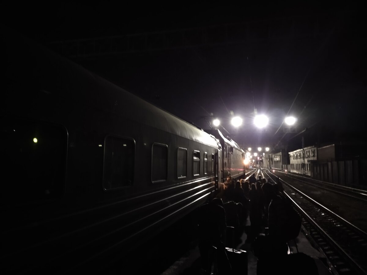 За окном показались яркие огни станции, где-то на горке ЧМЭ3 формировала состав, где-то в оборотниках ЭП2К готовились зайти под свои пассажирские поезда. Люблю такую вечернюю романтику. Как и думал, наш поезд прибыл к платформе, но пока вставать не спешил, только потом услышал что дверь открыли, а проводница говорит - курите быстро и назад. Так вышел почти весь поезд, но минут на 5-7, не более. Это обычная практика по всей сети. Подумал и сам вышел подышать, недолго перед сном. Как раз наш ЭП2К отцеплялся.