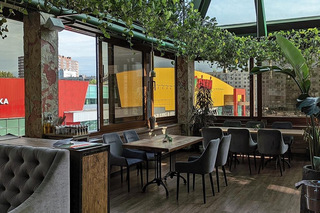 Кулинария на входе — все та же недвижимость, пусть и немного другой репертуар нынче в витринах. Появились всамделишный эскалатор и вполне ресторанная встреча с выбором мест. Конечно, тут я не требую спрашивать «вы у нас уже были?», проводить знакомство с уровнями и залами — тут на 99,16% все местные и сонные. Как сейчас: около часа дня субботнего, а в ресторане только несколько заспанных семей на поздних завтраках. Все в рамках концепта, все хорошо, а половину ресторана, по-прежнему, хочется фотографировать... Мне не нравится часть мебели: менял несколько сидений — как с наклоном вперед, так и неровные. Но выбор удобных мест есть, пусть и менее «видовых»: парковка «Окея» дарит почти мозаичный вид из сотен крыш авто. То в цветок складывался узор из транспорта популярных цветов, то в неприличное слово.