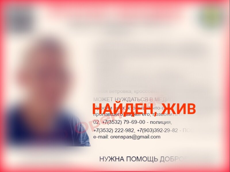 02, +7(3532) 79-69-00 — полиция, +7(3532) 222-982, +7(903)392-29-82 — ПСО «ОренСпас». По данным на 14.00 23 сентября, мужчина найден живым.