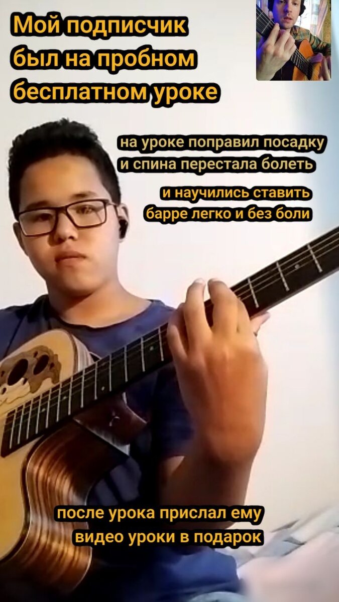 Занимался вчера с моим подписчиком из Самары. Запрос был у него - боль. 1. Боль в правой лопатке 2. Боль от барре. На бесплатном пробном уроке рассказал о том как сидеть с гитарой, чтобы ничего не болело. И поправил посадку ученику. И внимательно проработали левую руку и постановку барре. По барре обучающий ролик давно в закрепе. Плюс прикрепляю урок из моего видео курса для начинающих. Занимался вчера с моим подписчиком из Самары. Запрос был у него - боль. 1. Боль в правой лопатке 2. Боль от барре. На бесплатном пробном уроке рассказал о том как сидеть с гитарой, чтобы ничего не болело. И поправил посадку ученику. И внимательно проработали левую руку и постановку барре. По барре обучающий ролик давно в закрепе. Плюс прикрепляю урок из моего видео курса для начинающих. Ошибки в левой руке Как обычно у меня такой пробный урок для подписчика бесплатный. #гитара #обучение #урокигитары