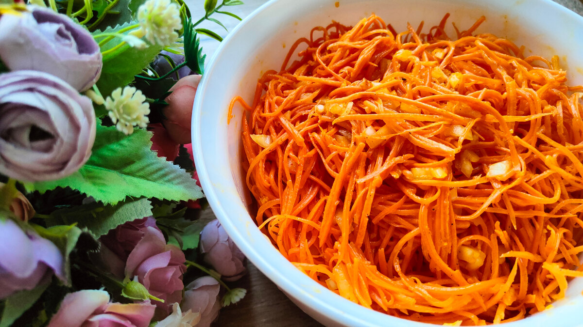 Приветствую вас на своём канале. Очень хочу угостить вас вот таким салатом. Готовится он легко и быстро!!! Ингредиенты: - морковь - 4 штуки - чеснок - 5 зубчиков - лук - 1/2 головки или 1 небольшая - соль - 1 чайная ложка - перец молотый - 1/2 чайной ложки - паприка копчёная - 1/2 чайной ложки - растительное масло - 50 миллилитров - уксусная эссенция 70% - 2 чайная ложка Способ приготовления достаточно простой и не особо хлопотливый, поэтому с приготовлением салата справится даже новичок. Морковь необходимо помыть и очистить от кожуры. Затем натереть на специальной тёрке. Натирать морковь необходимо в глубокую ёмкость. Стоит соблюдать меры предосторожности, так как в процессе натирания моркови можно повредить пальцы. Итак, морковь натёрли, теперь необходимо выдавить чеснок, также можно натереть его на мелкой тёрке. Отправляем наш чеснок к натертой морковке, также туда отправляем и чайную ложку соли. Далее добавляем черный молотый перец. Лук нарезаем как можно тоньше и мельче, но не