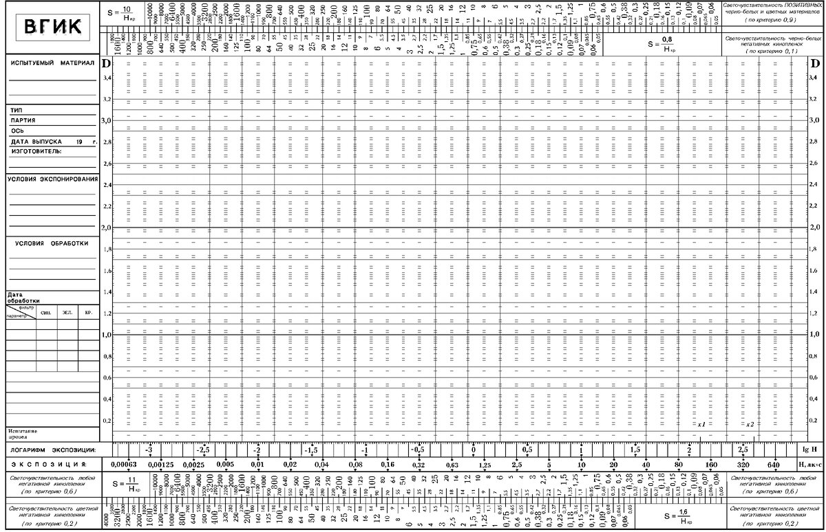 А по вертикальной оси отмесается ответ киноплёнки в виде плотности. Плотность полей промеряется на денситометре.