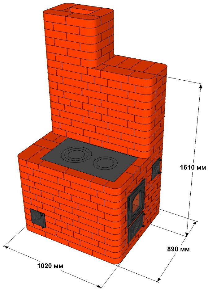 Эта небольшая (маленькая) дровяная отопительно варочная печь из кирпича, с варочной плитой, предназначена для отопления частного дома или дачи, площадью до 40 кв. метров, и приготовления пищи на чугунной двухконфорочной варочной плите. Длина основания печи — 102 см, ширина — 89 см. Высота ее, от поверхности чистого пола до верха отопительного щитка — 161 см, при стандартной толщине швов 5 мм. Для изготовления этого прибора требуется 424 шт. красных печных кирпичей, включая резаные (без учета дымовой трубы. Количество кирпичей для кладки дымовой трубы зависит от ее длины и вида противопожарных разделок в перекрытиях и в крыше. Эта маленькая дровяная печь из кирпича не имеет конструктивных сложностей, поэтому ее можно сделать (сложить) своими руками просто и быстро. Это обусловлено тем, что полностью отсутствует сложная обработка кирпича. Требуется только простая резка. Даже для начинающего печника кладка печи своими руками не представляет никакой сложности. Достаточно лишь кроить кирпи