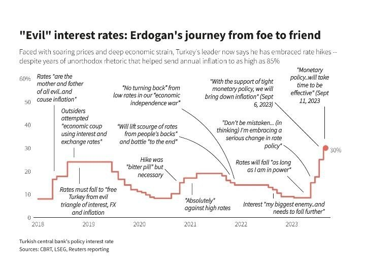 Reuter напоминает, что ранее президент Турции Реджеп Тайип Эрдоган называл себя «врагом» высоких процентных ставок, но их сдерживание привело к валютному кризису в конце 2021 года и разогнало инфляцию выше 85% в 2022-м. Лира ослабла почти на 70% за два года. После выборов, прошедших в мае 2023, Эрдоган, видимо, решил перейти на другие меры на фоне экономического кризиса. Он заявил, что необходима жесткая денежн