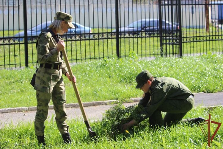Военнослужащие головного полка калиновского соединения по охране важных государственных объектов и специальных грузов Уральского округа войск национальной гвардии вместе с воспитанниками Екатеринбургского кадетского корпуса провели работы по благоустройству территории поселка Калиновка, прилегающей к кадетскому корпусу, а также облагородили посаженные в прошлом году деревья.