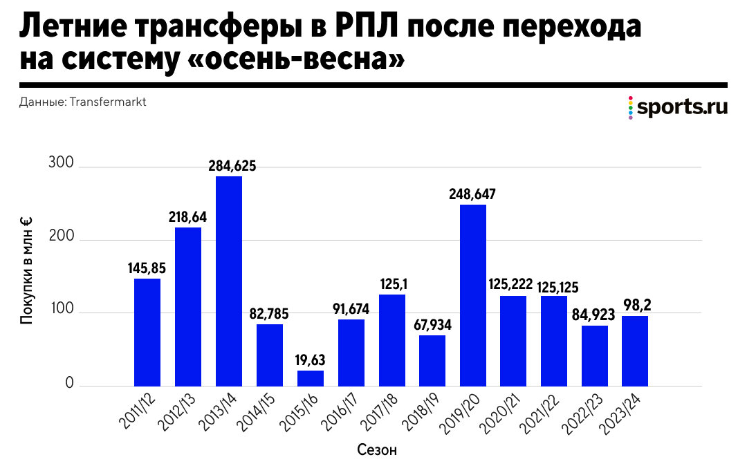 Хуже было в кризисные 2014-2015 годы: тогда летом клубы потратили 82,8 и 19,6 миллиона евро соответственно. Перед РПЛ-2015/16 мы увидели самую удивительную кампанию в истории: траты «Спартака» составили 61% от общих (12,5 млн на Зе Луиша и Попова, остальные клубы выложили 6,5 в сумме), сразу девять команд не оформили ни одного трансфера за деньги.