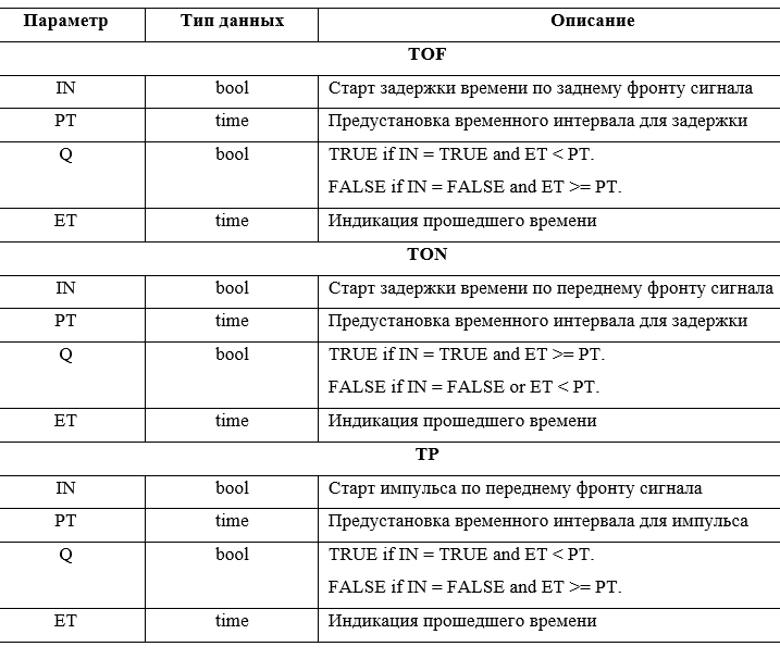 Таймер TON обеспечивает задержку по включению. Если на входе IN сигнал меняет свое значение с 0 (False) на 1 (True), переключение сигнала на выходе Q задерживается на время, заданное на входе PT. Прошедшее с момента изменения сигнала на входе время отображается на выходе ET. Вход IN и выход Q можно инвертировать.