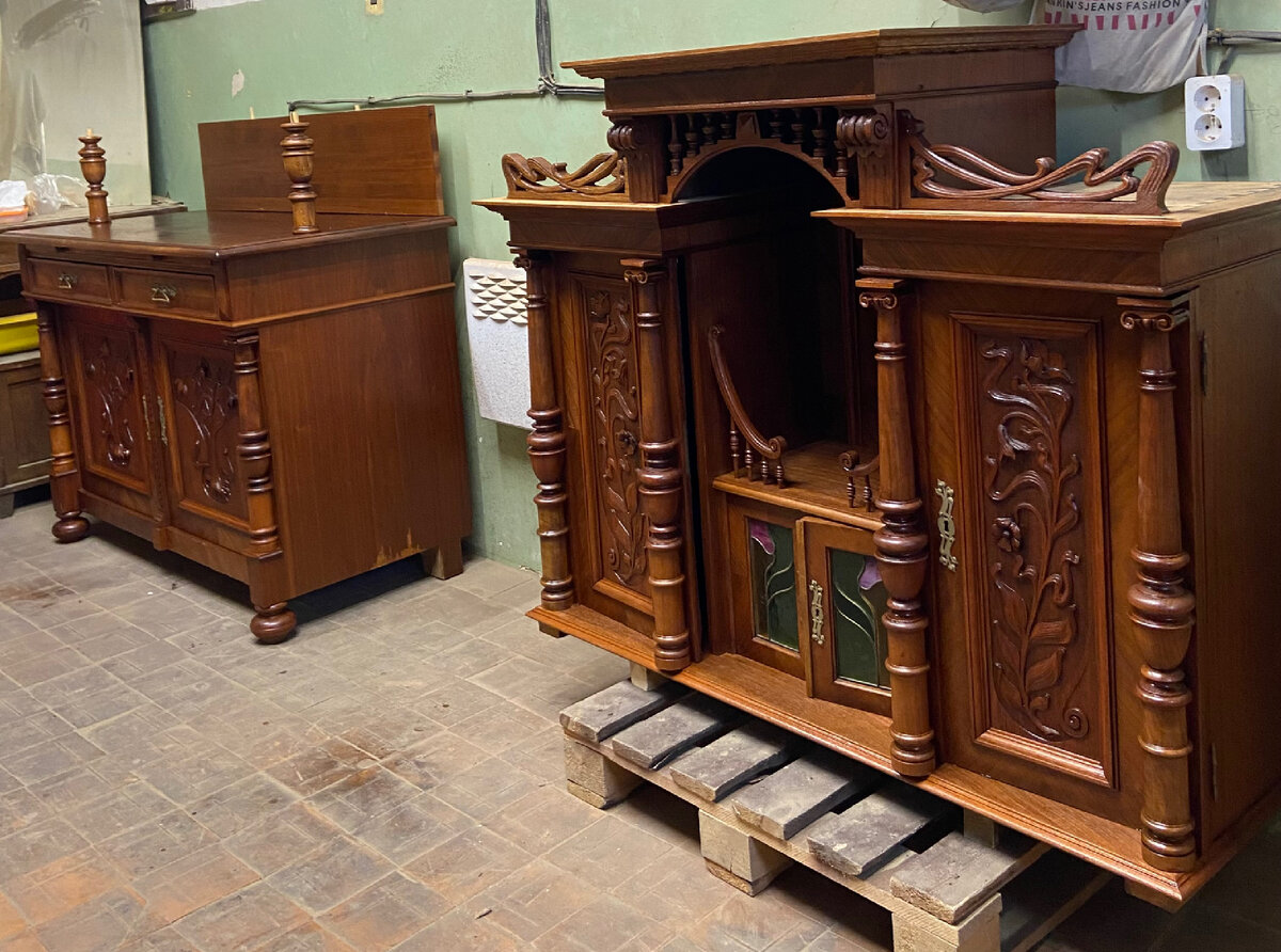 Часто сталкиваюсь с этим суждением. Как только люди, выбирая старые предметы интерьера, узнают, что они покрыты шпоном, тут же наступает череда сомнений и раздумий. Но мало кто знает, что шпон как отделочный материал для мебели использовали и 100 лет назад и более. Шикарный купеческий буфет, конец 19- начало 20 века, Россия. Весь шпонированный. Под шпоном черновая древесина, обычно сосна, а отделка уже более ценными породами, вроде ореха. Конечно же метод отделки Маркетри, который в принципе подразумевает дизайн, создаваемый из разных пород и форм шпона. В 40-50е годы начала использоваться фанера и она шпонировалась чаще всего дубом. Тоже не плохо, добротно и крепко. 60-70е годы пошла дсп, хотя часто встречается и мебельный щит, покрытые замечательным шпоном с красивейшим рисунком. И все это стоит не один десяток лет и не портится. Значит и не все так плохо со шпоном? А главное, что я хочу донести в этой статье, натуральный шпон- это не плохо. Он так же реставрируется, но с бол