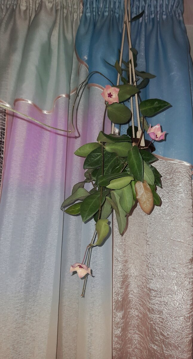 Пателла Пинк - одна из любимых моих хой. Эти нежные розовые колокольчики на фоне темно-зеленых бархатистых листиков просто завораживают. И помимо того, что эта хойя такая изящная красавица, она ещё и совсем неприхотлива. Она у меня год и за это время прилично выросла. Зацвела очень быстро, буквально черенком. И без конца даёт новые и новые росты и листья. Так вот, за все это время я не знала с ней проблем: она никогда не портит листья, как другие хойи, не теряет тургор, да и вообще проявляет себя только с положительных сторон))) Да, она иногда отсушивает новые росты, но это для меня не особо значимо, т.к. она тут же даёт новые. Поначалу я заморачивалась над этим, но по мере её роста перестала обращать на это внимание: пусть себе там делает, что хочет, ну отсушит - ещё вырастут, как-то в общей ее массе это не заметно. Висит она у меня на западном окне, летом притеняю тюлем. Кстати, ни разу её листики не сгорели на солнце, ни ожогов, ничего подобного не случалось с ней. Хотя дру