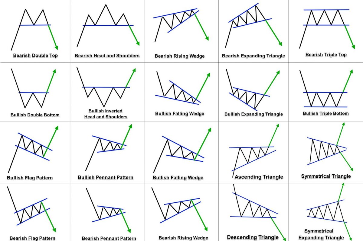 Паттерны в трейдинге - это повторяющиеся модели поведения цен на финансовых рынках, которые могут быть использованы для прогнозирования будущих движений. Они основаны на наблюдениях за тем, как цены акций, валют, товаров или других финансовых инструментов изменяются с течением времени. Паттерны могут быть связаны с различными аспектами торговли, включая поддержку и сопротивление, тренды, объемы торгов, а также психологические аспекты, такие как страх и жадность. Некоторые из наиболее распространенных паттернов в трейдинге включают: 1. "Голова и плечи": Этот паттерн обычно указывает на потенциальное изменение тренда и возможное движение цены в обратном направлении. 2. Двойное дно и двойная вершина: Эти паттерны указывают на возможное изменение тренда после того, как цена дважды коснулась определенного уровня. 3. Треугольники: Это паттерны, образующиеся на графиках, когда цена движется в узком диапазоне без четкого тренда. 4. Флаг и вымпел: Эти паттерны обычно указывают на продолжение