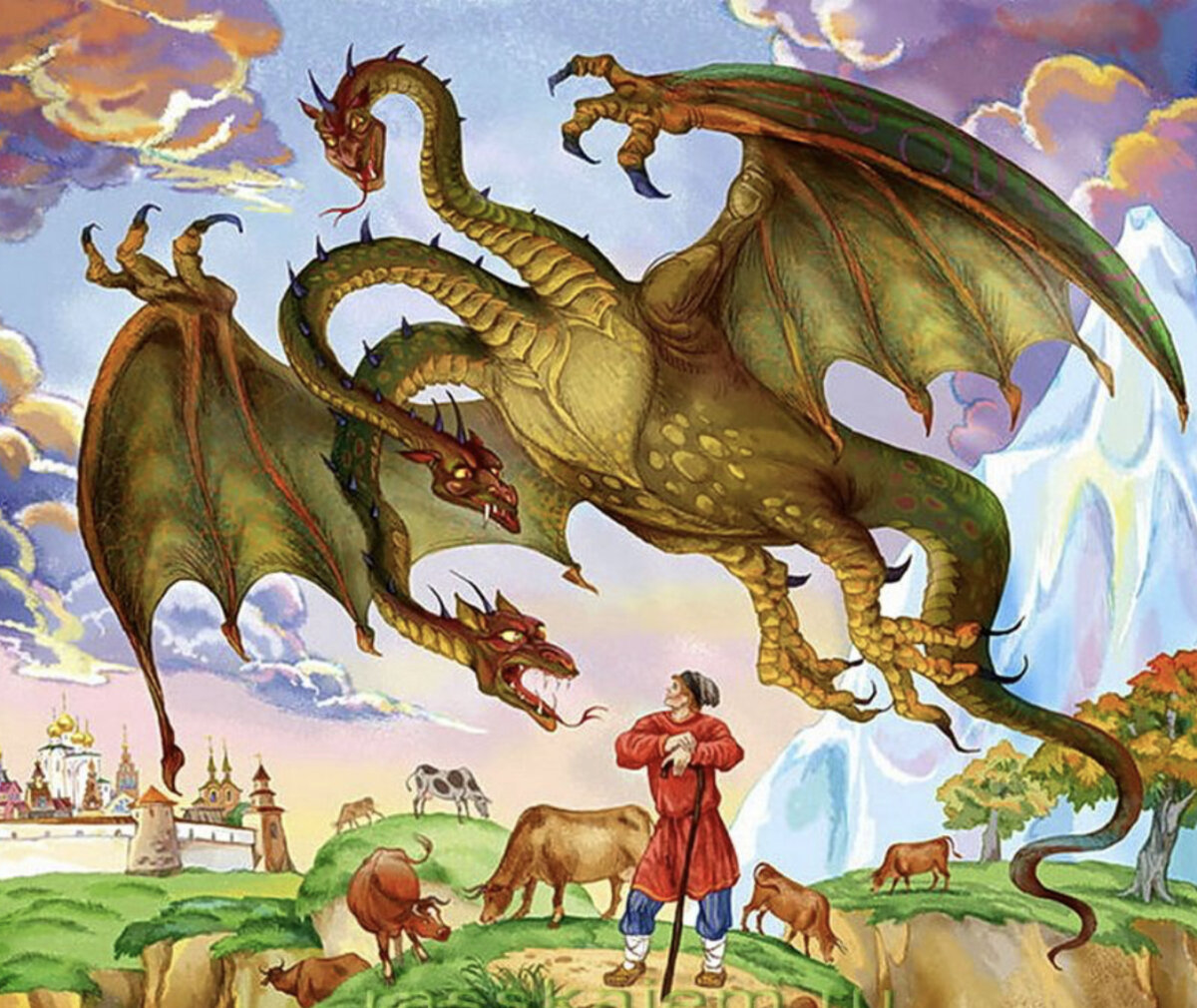 Описание: Достаточно велик, чтобы нести в когтях человека. Хвост, тело и все головы (числом от одной до дюжины) у змея, как легко догадаться, змеиные. Любопытно, что, хотя Горыныч и летает, о наличии у него крыльев прямо не сказано. Возможно, русские драконы использовали тот же механизм полёта, что и китайские. Образ жизни: Логово Змея, как правило, в горах — потому он и Горыныч. Но по воздуху эта рептилия способна покрывать огромные расстояния и потому может быть встречена везде. Подобно большинству других драконов, русский Змей питает труднообъяснимый интерес к знатным девицам. Способности: Змеиное пламя не превращает человека в пепел, а лишь обжигает. Измотав жертву, дракон вынужден либо приземлиться, чтобы пустить в ход зубы, либо схватить её когтями, поднять воздух и сбросить на камни. Происхождение: Мифы о драконах есть почти у всех народов. Возможно, среди предков русского Горыныча затесалась Лернейская гидра. Отсюда и многоглавость. Опасен? Несмотря на то, что русский дракон
