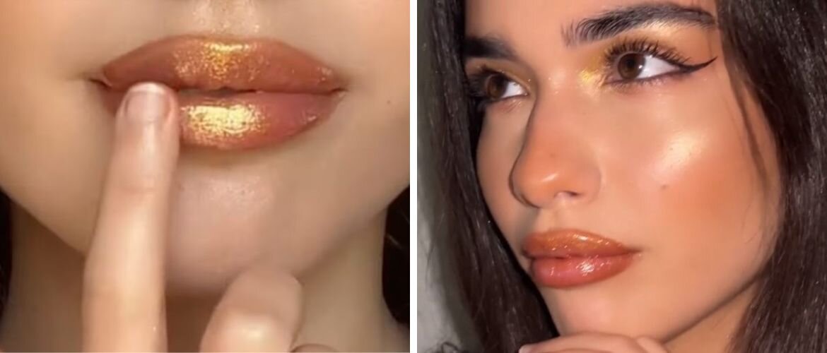 Наконец, самый важный шаг к созданию губ, похожих на мед, — блеск. Чтобы придать образу выразительности, можно использовать блеск с золотистым отливом. Масло для губ также поможет и увлажнит губы.