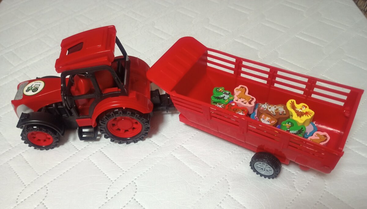 Этот мультик и песенка очень популярны у детей раннего возраста,особенно у мальчиков. Предлагаю вам вариант развивающей игры под песенку "По полям синий трактор едет к нам". Мультик нам не нужен, только песенка. Ещё понадобится трактор с прицепом и шнуровка с животными. Заменить можно на грузовик и фигурки животных. Итак, загружаем животных в прицеп и включаем песенку. Предлагаем ребенку управлять трактором. Как он едет по полям? "Тррр-тррр". Внимательно слушаем песенку. Как только слышим звук,как мычит коровка, предлагаем достать из прицепа ту фигурку животного, о которой поётся в песне. Ребенок достает корову,нанизывает на шнуровку и подражает звуку"му-му" вместе с мамой. Так мы проделываем со всеми животными. Если каких-то у вас нет, то можно подражать вместе с малышом звуку. Если ребенок ещё не освоил шнуровку, можно предложить доставать из прицепа животных, а мама будет их сама собирать на шнуровку. Игры на слух отличный вариант развития речи,а шнуровка прекрасно развивает мелку