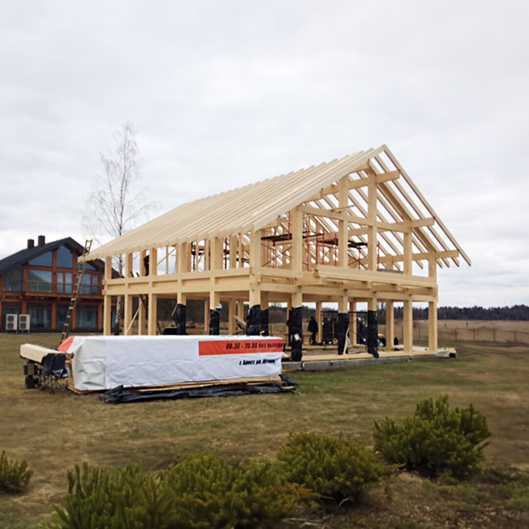 2. Изготовление конструкции будущего дома. АО «ТАМАК» уделяет огромное значение контролю качества входящих материалов. Благодаря особой ориентации ламелей сердцевиной наружу достигается высокая стабильность и прочность бруса. Мы изготавливаем балки из клееного бруса, длина которых достигает 12 метров, что дает возможность перекрытия больших пролетов и реализации самых смелых дизайнерских идей. 3. Готовый дом собирается как конструктор. Первым шагом в строительстве фахверкового дома является установка нижней обвязки или «стаканов». После этого устанавливаются вертикальные стойки, которые образуют силовой каркас дома. Они крепятся к нижней обвязке или «стаканам» и должны быт