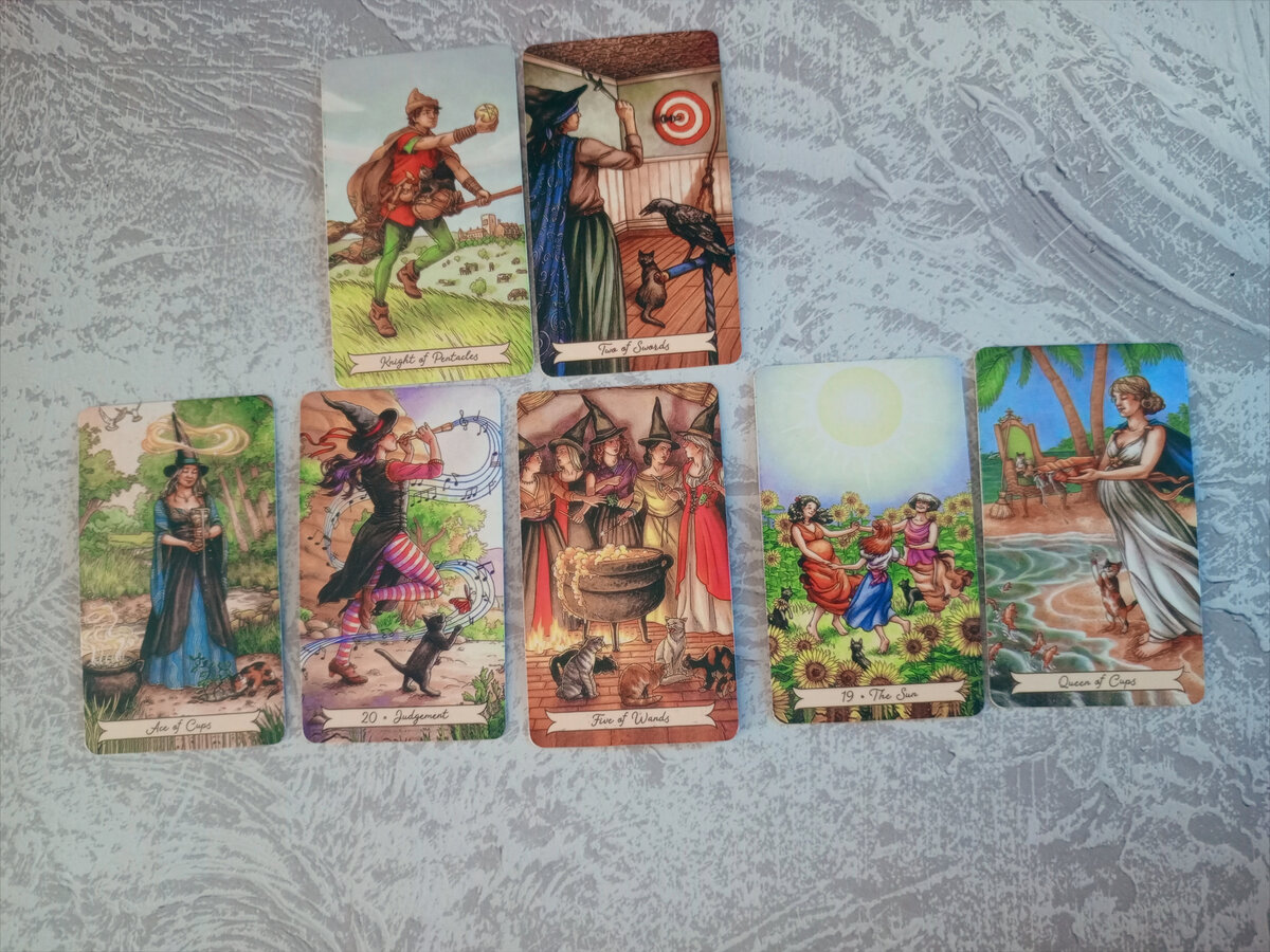 Что же будет в ближайшее время (срок месяц со дня прочтения): туз кубков, Старший аркан Верховный Суд, 4 жезлов, Старший аркан Солнце, королева кубков