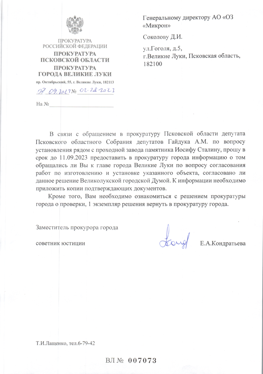 «Государево око» (как образно назвал прокуратуру ещё Пётр I) обратило своё пристальное внимание за неимением других проблем на Памятник Сталину в Великих Луках. Поводом для проверки стало обращение яблочного депутата Псковской области Артура Марковича Гайдука. Артур Маркович известен активной позицией практически по всем насущным вопросам жизни и деятельности общества. Во времена «pandemii» он предлагал упорядочить возможность и утвердить перечень оснований для покидания гражданами жилищ. Совсем недавно категорически протестовал против запрета операций по смене пола и даже обещал публично совершить это действо над собой, и стать наконец полноценной женщиной. И, конечно, не мог он пройти и не прошёл мимо Памятника Сталину, рассчитывая и здесь попасть в «большие забияки». Прокурорскую проверку взяло на особый контроль радио «Свобода», где Гайдук на особом положительном счету. ©️Виктор Волхов/12.09.23